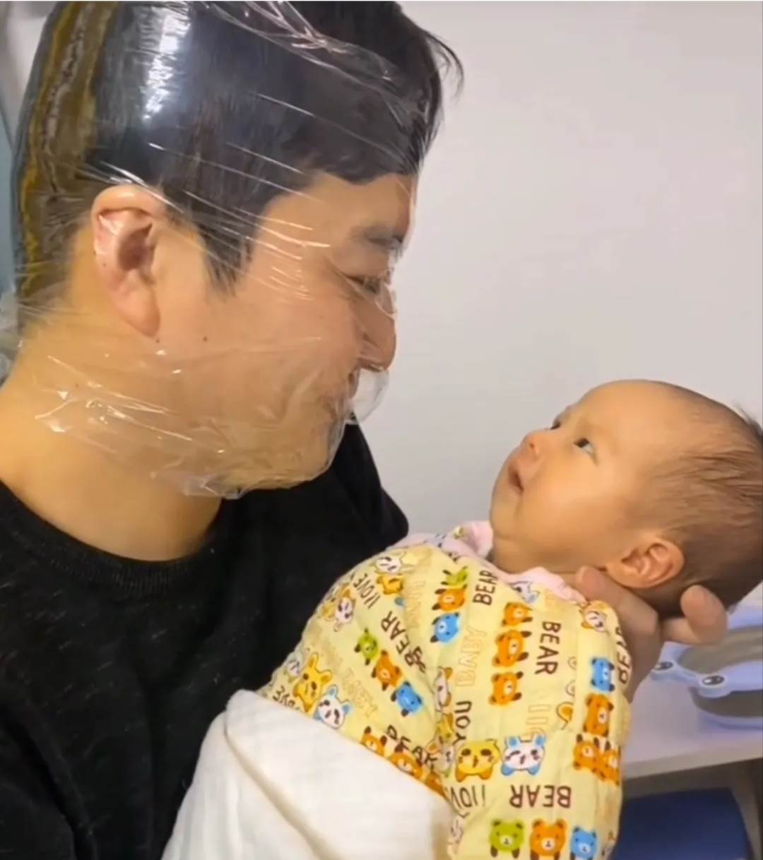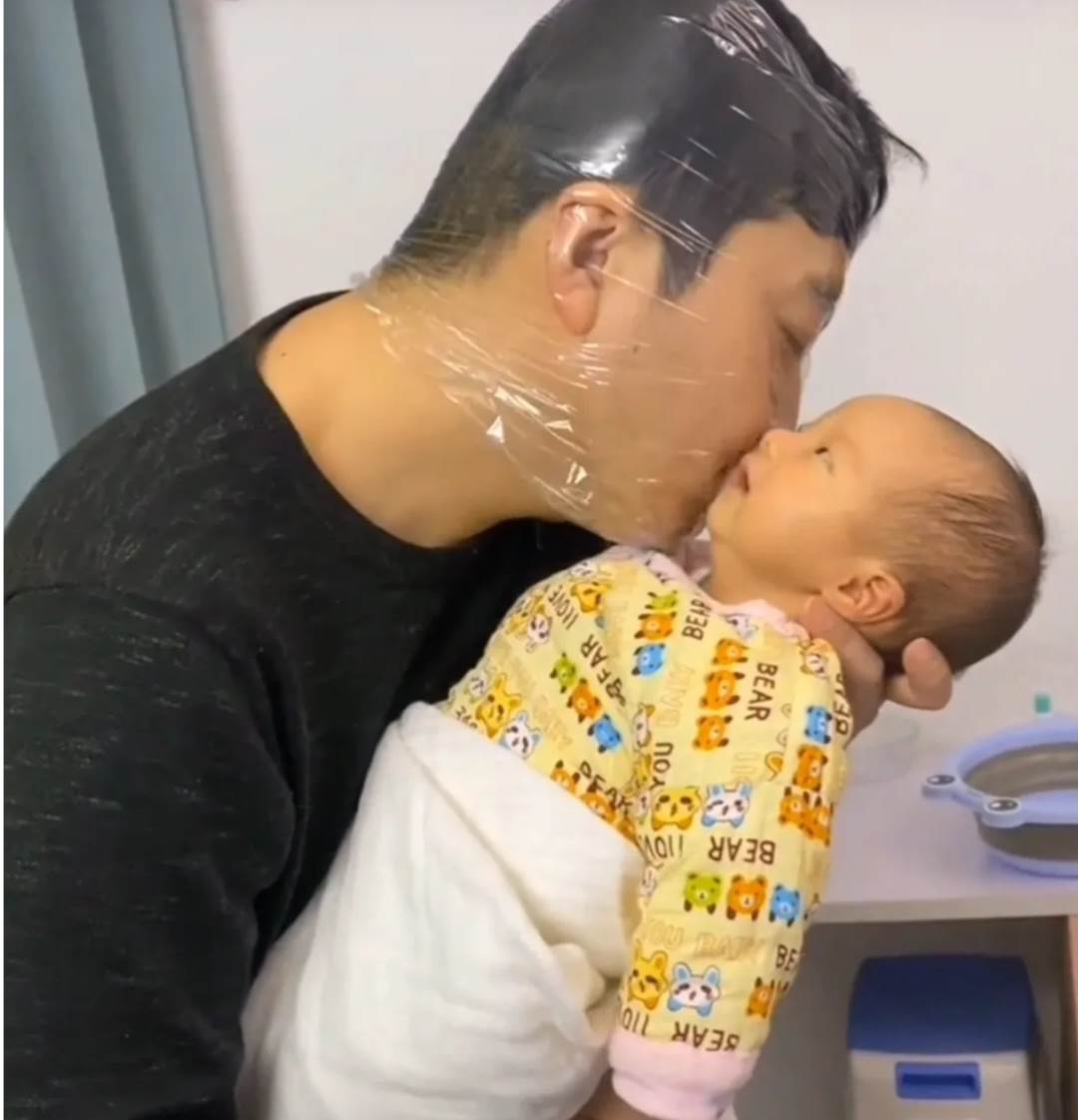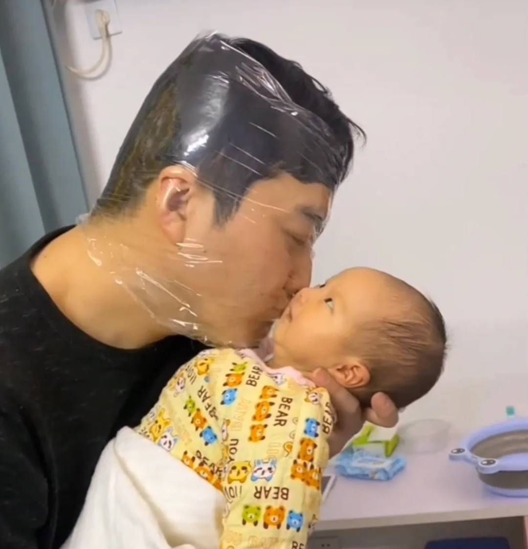 也正因如此,这位来自南京的老爸就想了一个妙招,他用家里的保鲜膜裹住了自己的头,之后便放心地隔着保鲜膜去亲吻孩子了。